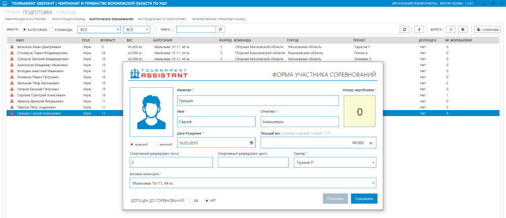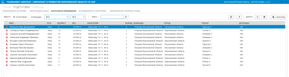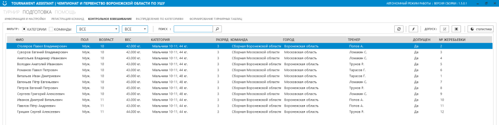 После раздела “Регистрация команд” следует раздел “Контрольное взвешивание”. В данном разделе осуществляется допуск участников до соревнований. Имеется возможность как обработать каждого спортсмена отдельно вручную, так и автоматически весь список в зависимости от настройки принципа жеребьёвки спортсменов.