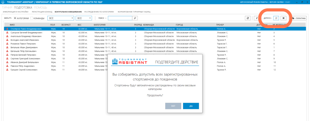 После заполнения номера жеребьёвки (если выбрано ручное рапределение, при автоматическом это делать не нужно) можно допустить всех зарегистрированных спортсменов и они автоматически распределятся по своим весовым категориям, которые определены в настройках турнира