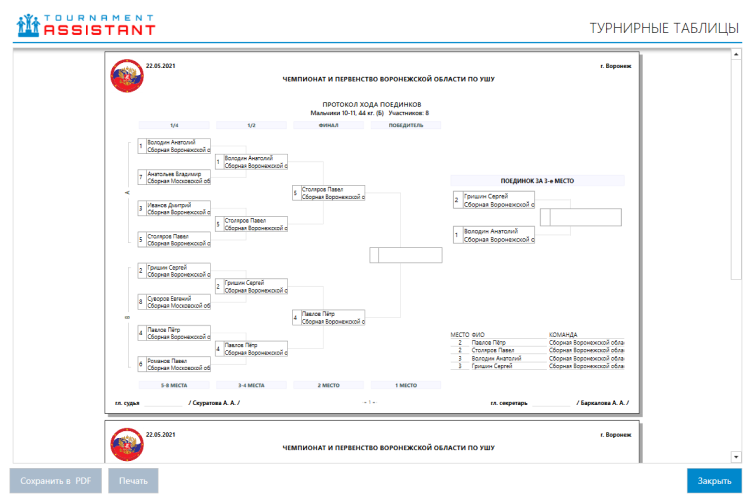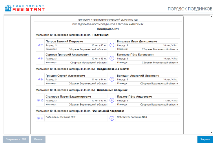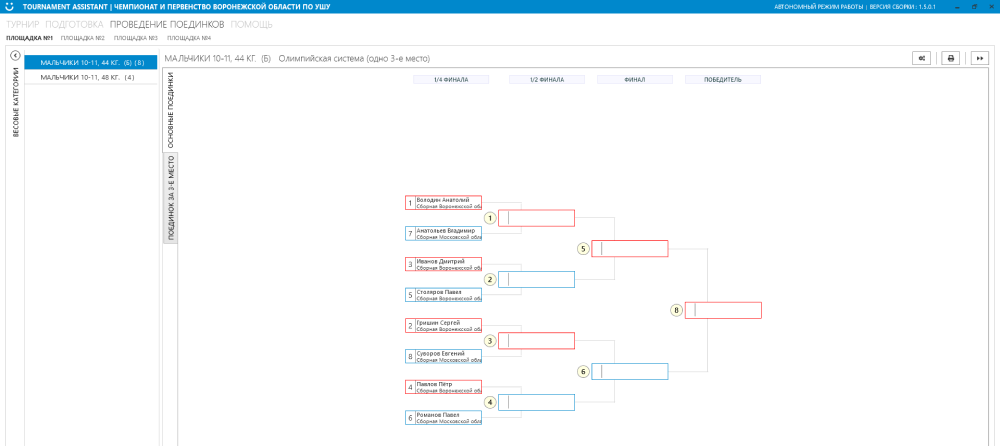 Переход к стадии “Проведение поединков”. Функционал данной части позволяет выбрать победителя для каждого поединка, изменить настройки категории (при необходимости смены типа проведения поединков или смены площадки проедение поединков) и сформировать и распечатать документы последовательности поединков, тернирных таблиц (для всех или отдельной площадки).
