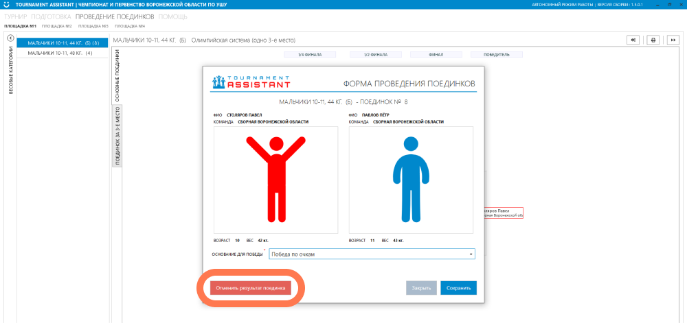 При необходимости, имеется возможность отменить результат поединка (начиная с последнего завершённого).